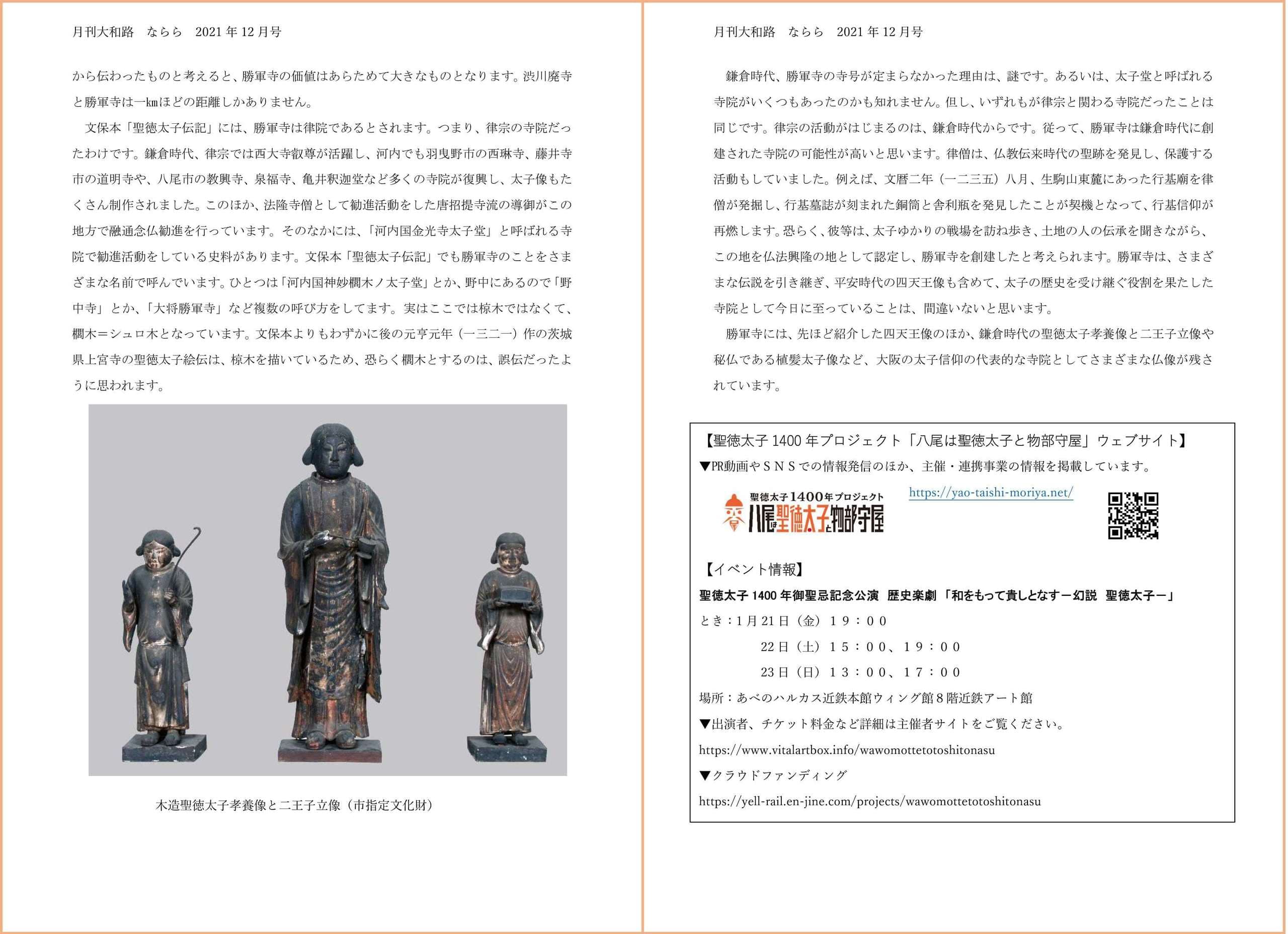 2021年12月号「連載2 聖徳太子信仰と大聖勝軍寺」では、物部氏との戦いで聖徳太子の命を救ったとされる椋の樹がある大聖勝軍寺と太子信仰について解説します。