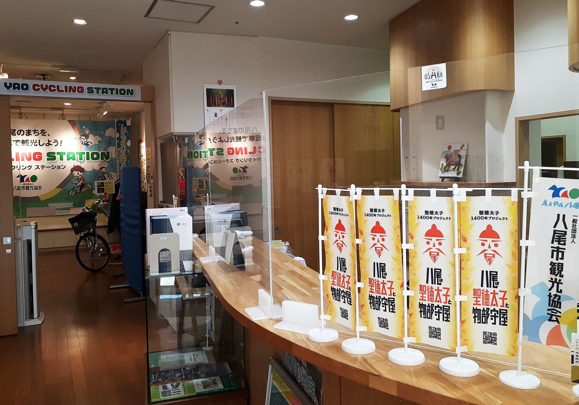 プロジェクトロゴを縦組みに配置したのぼりは、通常サイズと卓上サイズの2種類。八尾市役所や八尾市観光協会に掲出していますので、ぜひお越しの際はチェックしてみてください。のぼりはプロジェクト周知のため、イベントなど今後さまざまな場所で使っていく予定です。